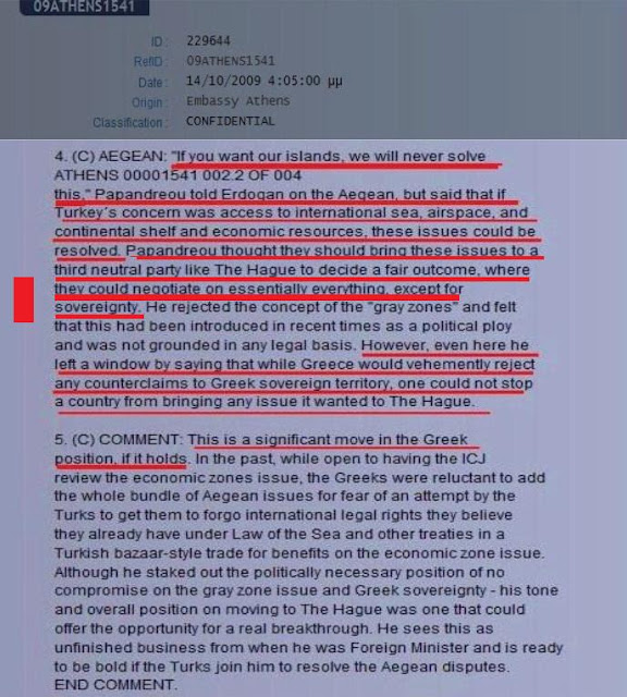Σύμφωνα με το υπόψη τηλεγράφημα ο Έλληνας πρωθυπουργός Γ. Παπανδρέου, φέρεται να είπε στον Τ.Ερντογάν:
