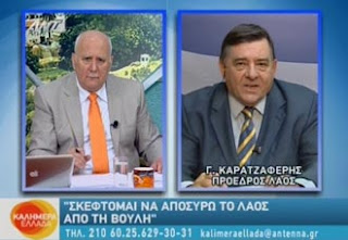 Απογοητευμένος από το «πτωχευμένο» πολιτικό σύστημα, όπως το χαρακτήρισε, ο πρόεδρος του ΛΑΟΣ Γιώργος Καρατζαφέρης αποκάλυψε ότι σκέφτεται να αποσύρει το ΛΑΟΣ από την Βουλή «για να λειτουργήσει ως χαστούκι στο λιποθυμισμένο πολιτικό σύστημα».
