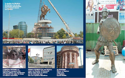 Αγάλματα αρχαίων Μακεδόνων στρατιωτών που κρατούν στα χέρια τους δόρατα και ασπίδες με τον ήλιο της Βεργίνας θα περιστοιχίζουν τον επιβλητικό ανδριάντα του Μεγάλου Αλεξάνδρου με ύψος οκταόροφης πολυκατοικίας, που έστησε στην κεντρική πλατεία των Σκοπίων η εθνικιστική κυβέρνηση του κ.Νίκολα Γκρουέφσκι που διεκδικεί ευθέως το copyright της ιστορικής και πολιτιστικής κληρονομιάς της αρχαίας Μακεδονίας.