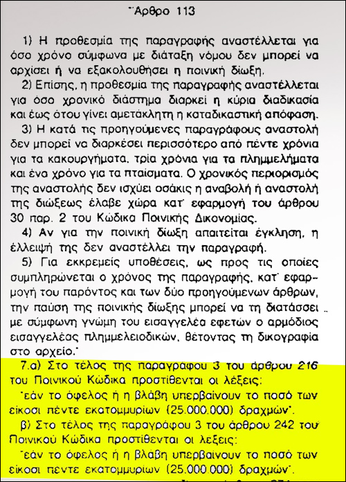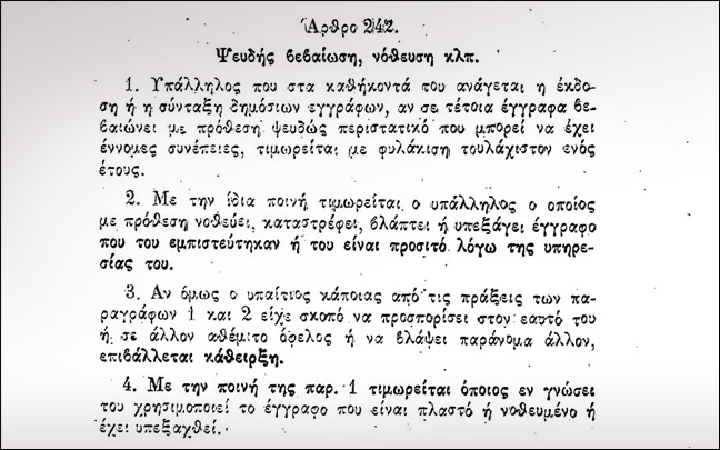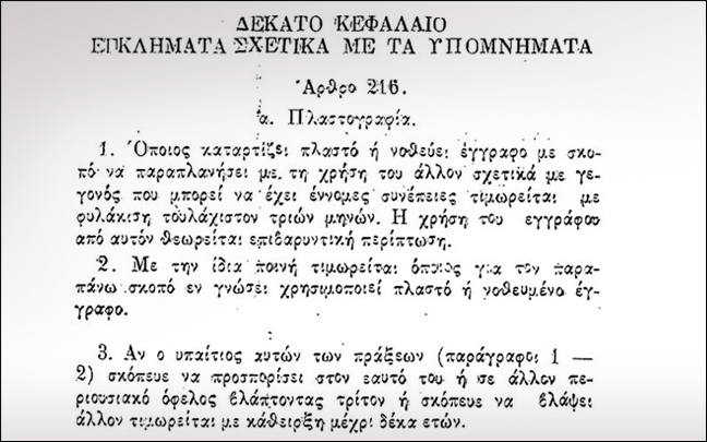 Αναζήτησα λοιπόν αυτή την νομική σας έστω ευφυΐα, στο νομοθετικό σας έργο στο υπουργείο Δικαιοσύνης. Και ιδού τι βρήκα. Το 1996 ψηφίσατε τον νόμο 2408. Με τον νόμο αυτό τροποποιήσατε κάποια άρθρα του Ποινικού Κώδικα. Για την ακρίβεια προσθέσατε μερικές λέξεις, λιγότερες από 10 αλλά καθοριστικές. Αλλάξατε το άρθρο 242 (για ψευδή βεβαίωση) και το άρθρο 216 (για πλαστογραφία).Τα δύο αδικήματα τα οποία ήταν κακουργήματα με ποινές κάθειρξης πάνω από 10 χρόνια, γίνονταν πλημμελήματα αν το ποσό της ζημιάς δεν ήταν πάνω από 25 εκατομμύρια δραχμές. Αυτό προσθέσατε: Το «πάνω από 25 εκατομμύρια δραχμές». Με 25 εκατομμύρια τότε μπορούσες να αγοράσεις ένα σπίτι. Και εσείς για κάποιο λόγο, την πλαστογραφία και την ψευδή βεβαίωση που προκαλούσαν ζημιά ως ένα σπίτι την κάνατε πλημμέλημα;