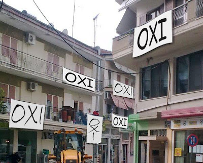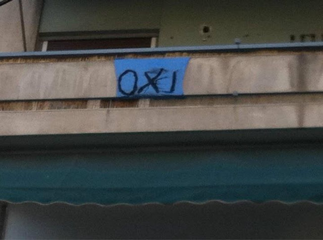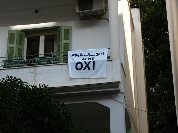 ————————————- If not now, then when? If not us, then who? “NO” means resistance. We are uniting under this message. One year and a half now, Greece is sinking because of the choices of the governmental party and the troika. We do not want any more of this allegedly salvation. We are all hanging from our balconies a white flag saying NO, starting this Monday, with the pick on our national holiday on the 28th and for as long as it takes we are saying a new NO! Si no es ahora, ¿cuándo? Si no somos nosotros, ¿quién? “No” significa resistencia. Nos unimos bajo este mensaje. Durante el último año y medio nos hundimos como país, por culpa del gobierno y de la Troika. No queremos otra supuesta salvación. A partir de este lunes, colgamos en nuestros balcones una tela blanca que pone NO, acción que culmina el 28O y decimos un nuevo “NO” por el tiempo que sea necesario. Se non adesso, qaundo? Se non siamo noi, chi? “OXI” (NO) significa resistenza. Uniamoci sotto questo messaggio. Da un anno e mezzo ci seppelliamo come paese, a causa delle scelte del nostro governo e della “Troika”.Non desiseriamo più una falsa salvezza. Appendiamo tutti ai nostri balconi uno striscione bianco con la scritta “OXI” (NO),a partire da Lunedi 24/10 per la giornata della festa nazionale del 28 di Ottobre e fino a quando sarrà necessario a dire NO! Wenn nicht jetzt wann? Wenn nicht wir wer sonst? “OXI” (nein) bedeutet widerstand. Wir vereinen uns unter diesem motto. Seit eineinhalb jahren gehen wir als land unter, wegen der entscheidungen der regierung und der troika. Wir wollen keine weitere angebliche rettung. Wir hängen alle an unsere balkone ein weisses tuch auf den steht “OXI” (nein). Ab montag mit höhepunkt den 28 Oktober und so lange es dauert sagen wir ein neues “OXI” (nein)! |