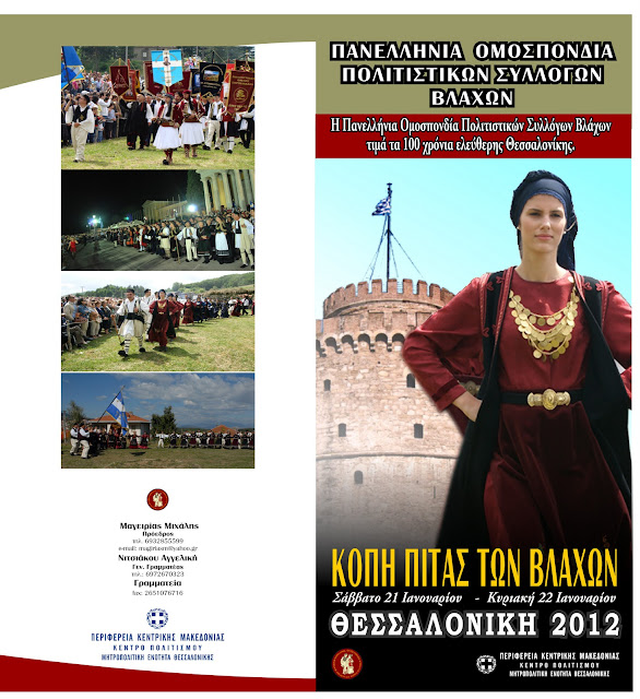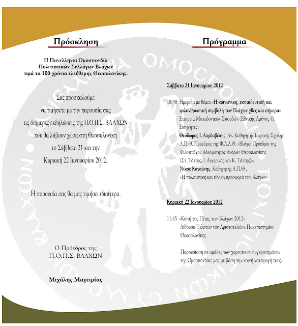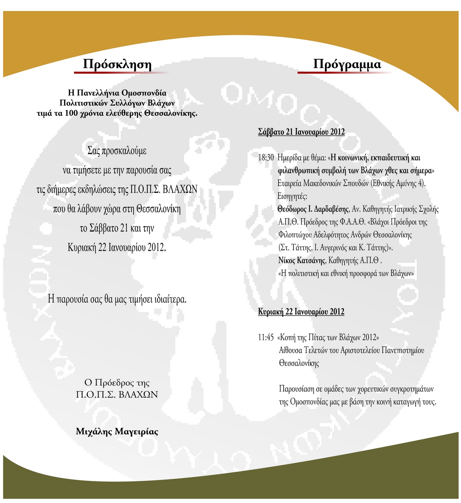 Σας προσκαλούμε να τιμήσετε με την παρουσία σας τις διήμερες εκδηλώσεις της Π.Ο.Π.Σ.ΒΛΑΧΩΝ ,αφιερωμένες στα 100 χρόνια ελεύθερης Θεσσαλονίκης ,το Σάββατο 21 και την Κυριακή 22 Ιανουαρίου 2012.
