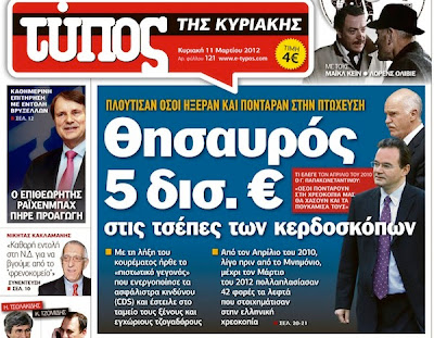 κατάλληλη πληροφόρηση και πόνταραν εγκαίρως στη χρεοκοπία της χώρας μας μέσω των ασφαλίστρων κινδύνου -των περιβόητων CDS- θα μοιραστούν 2,3 έως 5 δισ. ευρώ. Παράλληλα, αποκτούν ισχυρό κίνητρο για να συνεχίσουν να επενδύουν στις πιθανότητες χρεοκοπίας ευάλωτων κρατών. Δηλαδή, συμβαίνει ακριβώς το αντίθετο από αυτό που διατυμπάνιζε με πάθος ο τέως υπουργός Οικονομικών Γιώργος Παπακωνσταντίνου, ο οποίος διετείνετο τον Απρίλιο του 2010 από την έδρα του ΔΝΤ στην Ουάσιγκτον: «Κάποιοι κερδοσκόποι θα χάσουν και τα πουκάμισά τους». Χάρη στην πολιτική που χάραξαν ο ίδιος, ο διάδοχός του Ευάγγελος Βενιζέλος και, βεβαίως, ο τέως πρωθυπουργός Γιώργος Παπανδρέου τα «γεράκια» των αγορών τώρα… ράβουν νέα πανάκριβα πουκάμισα.