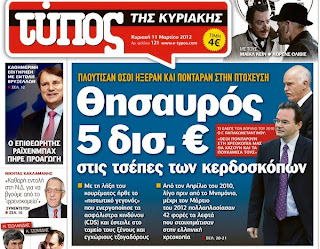 κατάλληλη πληροφόρηση και πόνταραν εγκαίρως στη χρεοκοπία της χώρας μας μέσω των ασφαλίστρων κινδύνου -των περιβόητων CDS- θα μοιραστούν 2,3 έως 5 δισ. ευρώ. Παράλληλα, αποκτούν ισχυρό κίνητρο για να συνεχίσουν να επενδύουν στις πιθανότητες χρεοκοπίας ευάλωτων κρατών. Δηλαδή, συμβαίνει ακριβώς το αντίθετο από αυτό που διατυμπάνιζε με πάθος ο τέως υπουργός Οικονομικών Γιώργος Παπακωνσταντίνου, ο οποίος διετείνετο τον Απρίλιο του 2010 από την έδρα του ΔΝΤ στην Ουάσιγκτον: «Κάποιοι κερδοσκόποι θα χάσουν και τα πουκάμισά τους». Χάρη στην πολιτική που χάραξαν ο ίδιος, ο διάδοχός του Ευάγγελος Βενιζέλος και, βεβαίως, ο τέως πρωθυπουργός Γιώργος Παπανδρέου τα «γεράκια» των αγορών τώρα… ράβουν νέα πανάκριβα πουκάμισα.
