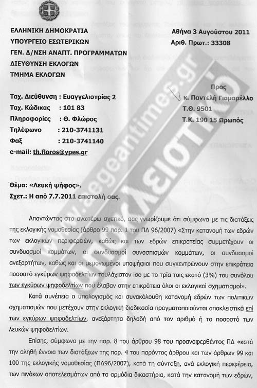 Και επειδή η εκστρατεία παραπληροφόρησης καλά κρατεί, και όλο και θα βρεθούν ορισμένοι που θα επιμείνουν στους ψευδείς ισχυρισμούς τους δημοσιεύουμε σήμερα, την απάντηση του υπουργείου Εσωτερικών, σε ερώτημα που είχε υποβάλει επισήμως, τον Αύγουστο του 2011, ο κ. Παντελής Γιαμαρέλλος, από όπου προκύπτει ο ψευδής ισχυρισμός, όσων υποστηρίζουν ότι με την λευκή ψήφο του 51% των ψηφοφόρων, μπορεί να ακυρωθούν οι εκλογές. Ετσι ώστε να σταματήσει εδώ και τώρα η αήθης αυτή εκστρατεία παραπλάνησης του Ελληνικού λαού από συγκεκριμένα κέντρα και παράκεντρα εξουσίας!