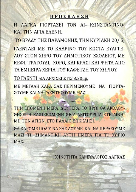 Η Λάγκα γιορταζει τον Άι– Κωνσταντίνο και την Αγία Ελένη.