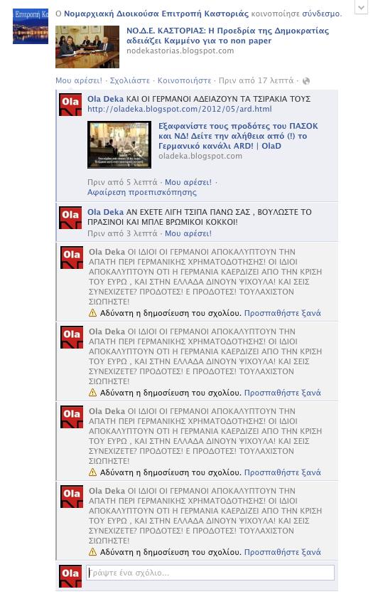 Όταν και ο πιο ανύποπτος πλέον κατανοεί το βρώμικο παιχνίδι των δυνάμεων κατοχής που ξεσκεπάζεται σιγά σιγά, οι τοπικοί Καστοριανοί θιασώτες του ερέβους συνεχίζουν και ποστάρουν στο Facebook μαύρη προπαγάνδα για αντιμνημονιακούς χωρίς ν αγγίζονται από τις χιονοστιβάδες αποκαλύψεων από τα διεθνή ελεύθερα ΜΜΕ!