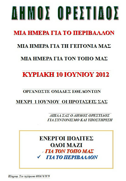 Ο Δήμος Ορεστίδος καλεί τους Δημότες του να οργανώσουν ομάδες εθελοντών για να καταθέσουν τις προτάσεις τους μέχρι την 1 Ιουνίου για το περιβάλλον και την Κυριακή 10 Ιουνίου να γίνουν πράξη.