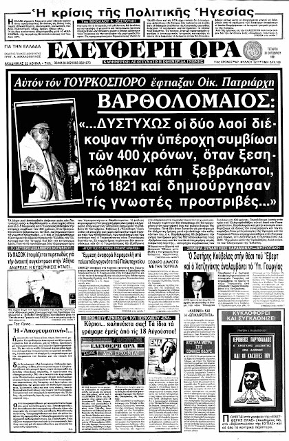Λίγους μήνες μετά το συνέδριο της Καμπέρα, τον Οκτώβριο του 1991, ο τότε επίσκοπος Χαλκηδόνος Βαρθολομαίος τόλμησε να σπιλώσει την μνήμη των ηρώων της επανάστασης του 1821, με την εξής δήλωση: «Δυστυχώς οι δυο λαοί διέκοψαν την υπέροχη συμβίωση των 400 χρόνων, όταν ξεσηκώθηκαν κάτι ξεβράκωτοι το 1821 και δημιούργησαν τις γνωστές προστριβές». (Η φιλοτουρκική δήλωση του Πατριάρχη, έγινε μια μόλις βδομάδα πριν την ενθρόνισή του σε Πατριάρχη Κωνσταντινουπόλεως στις 2 Νοεμβρίου του 1991 και δημοσιεύτηκε από τις εφημερίδες Αυριανή και Ελεύθερη ώρα – 30 Οκτωβρίου 1991).