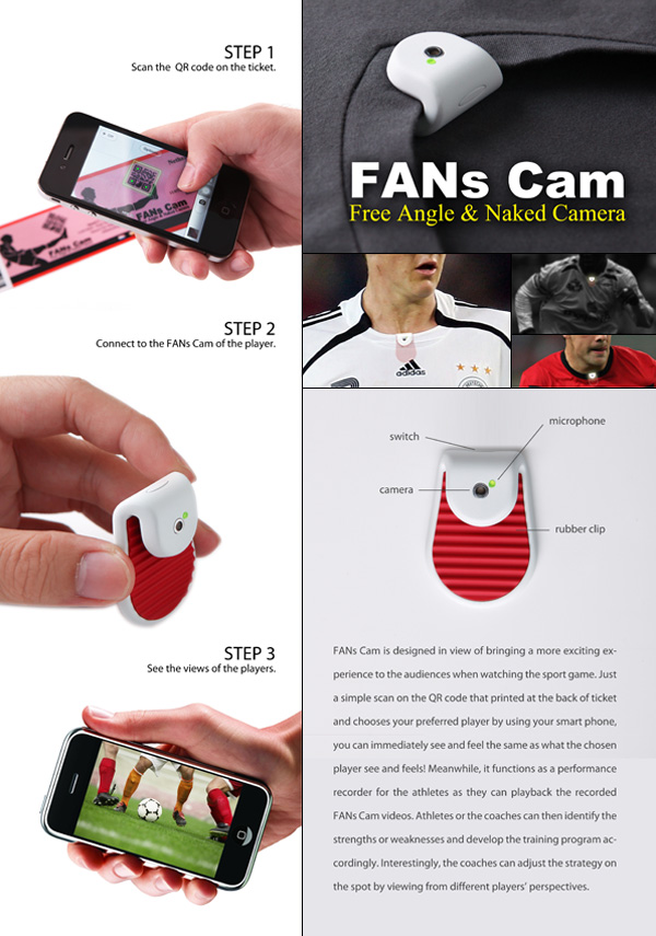 Πολλοί από εμάς επιλέγουμε να παρακολουθούμε τα αθλητικά από την άνεση του σπιτιού μας μέσω διαδραστικής τηλεόρασης που καλύπτεται με πολλαπλές γωνίες κάμερας.Αλλά ακόμα κι έτσι, η άποψή μας για τη δράση του αγώνα, εξακολουθεί να είναι περιορισμένη στο σημείο που επικεντρώνεται από το πλήρωμα της παραγωγής. Ακόμα και οι οπαδοί στις κερκίδες αδυνατούν να παρακολουθήσουν σημαντικές φάσεις του αγώνα. Έτσι, δύο φοιτητές από το National Cheng Kung University έχουν στόχο να το αλλάξουν αυτό. Σχεδίασαν μία κάμερα με το όνομα “Fans Cam” η οποία υπόσχεται να προσφέρει κάθε άποψη από τον αγώνα φορώντας την όλοι οι παίκτες απάνω τους πολύ εύκολα σαν ένα απλό κλιπ,δίνοντας στην κάμερα μια προοπτική του παιχνιδιού που δεν έχετε ξαναζήσει. Το βίντεομπορεί να γίνει απ’ ευθείας προσβάσιμο μετά από μια απλή σάρωση του QR κωδικού που αναγράφεται