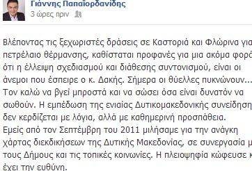 Με μήνυμά του στον προσωπικό του «τοίχο» στο facebook, ο επικεφαλής της μείζονος αντιπολίτευσης στο περιφερειακό συμβούλιο Δ. Μακεδονίας κ. Γιάννης Παπαϊορδανίδης κάλεσε τον περιφερειάρχη κ. Γιώργο Δακή να βγει μπροστά για το πετρέλαιο θέρμανσης.Δείτε τι έγραψε ακριβώς: