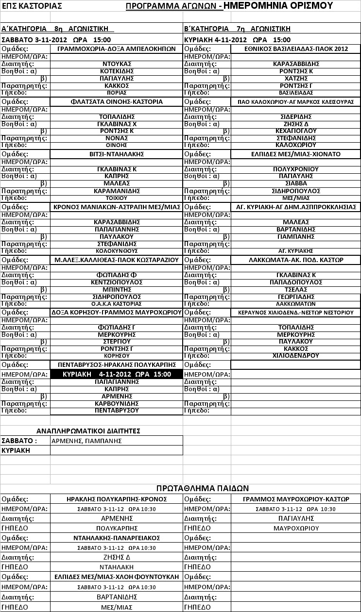 Η Επιτροπή Διαιτησίας της Ε.Π.Σ. Καστοριάς ανακοινώνει τους διαιτητές και τους βοηθούς των αγώνων της 8ης αγωνιστικής της Α΄ κατηγορίας και της 7ης αγωνιστικής της Β΄ κατηγορίας: