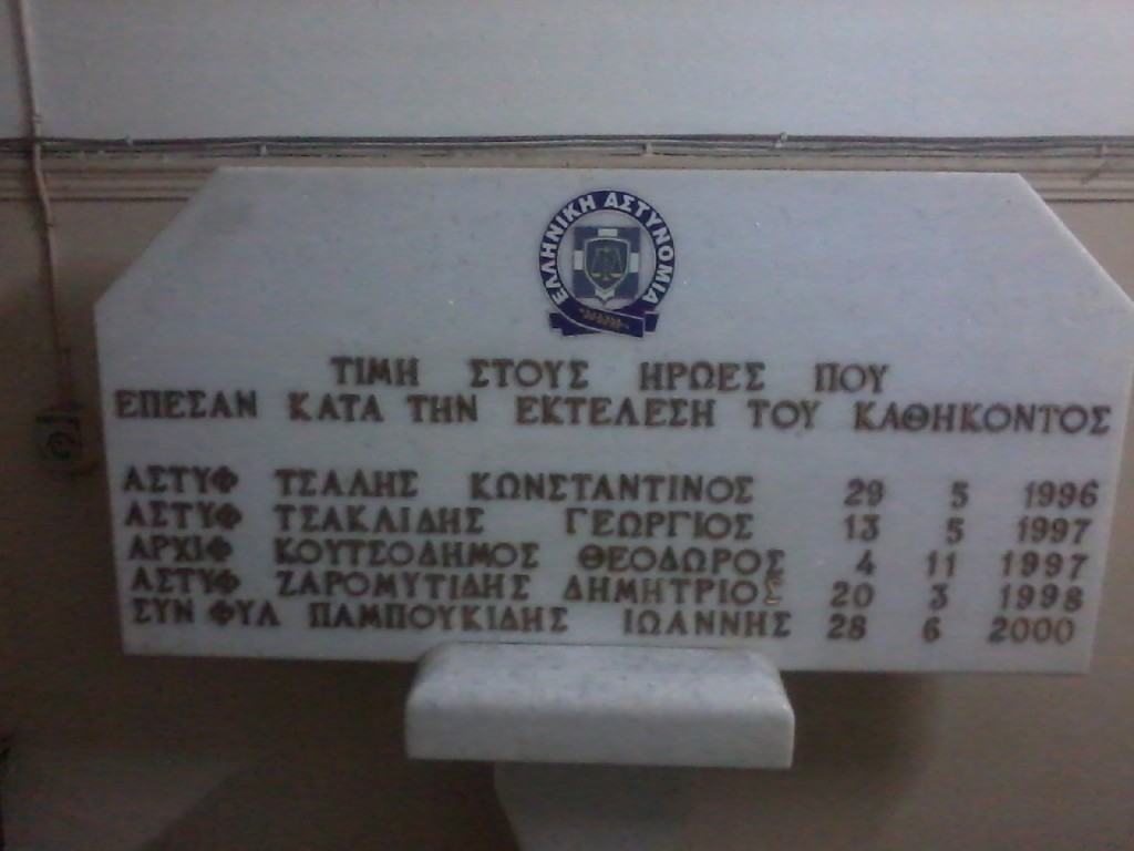 Με πρωτοβουλία της Ένωσης Αστυνομικών Ν. Καστοριάς τοποθετήθηκε αναθηματική στήλη στην είσοδο της Αστυνομικής Διεύθυνσης με τους πεσόντες εν ώρα υπηρεσίας συναδέλφους Αστυνομικούς της Αστυνομικής Διεύθυνσης Καστοριάς σε ένδειξη τιμής, σεβασμού και αναγνώρισης της