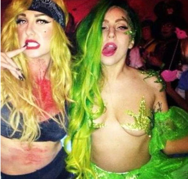 Δυο γκλίτερ αυτοκόλλητα σε σχήμα φύλλου μαριχουάνας (που καλύπτουν τις θηλές της) και μια πράσινη περούκα ήταν η αμφίεση που διάλεξε αυτή την φορά για να προκαλέσει η Λέιντι Γκάγκα. Η οποία μάλλον αποφάσισε να επιδείξει την σεξουαλικότητά της μετά από μήνες που πέρασε υπό σφυροκόπημα εξαιτίας των παραπανίσιων κιλών της.