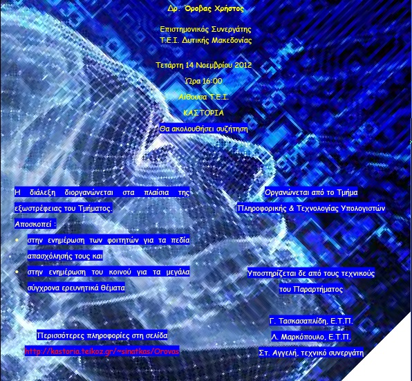 Την Τετάρτη 14 Νοεμβρίου 2012 και ώρα 16:00 το Τμήμα Πληροφορικής και Τεχνολογίας Υπολογιστών του Τ.Ε.Ι. Δυτικής Μακεδονίας, σε αίθουσα του Παραρτήματος Καστοριάς,