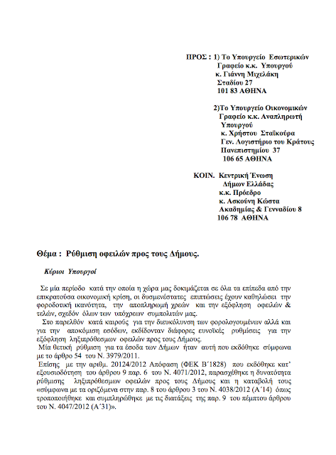 Η επιστολή έχει αποδέκτες τον Υπουργό Εσωτερικών κ. Γιάννη Μιχελάκη και τον αναπληρωτή Υπουργό Οικονομικών κ. Χρήστο Σταϊκούρα, από τους οποίους ζητείται η θέσπιση ρύθμισης και διακανονισμού χρεών που έχουν οι πολίτες προς τους Ο.Τ.Α. και η επέκταση των ευνοϊκών ρυθμίσεων που ισχύουν και εφαρμόζονται σε οφειλές που έχουν οι Έλληνες πολίτες προς το κράτος και για τις οφειλές προς τους Ο.Τ.Α.