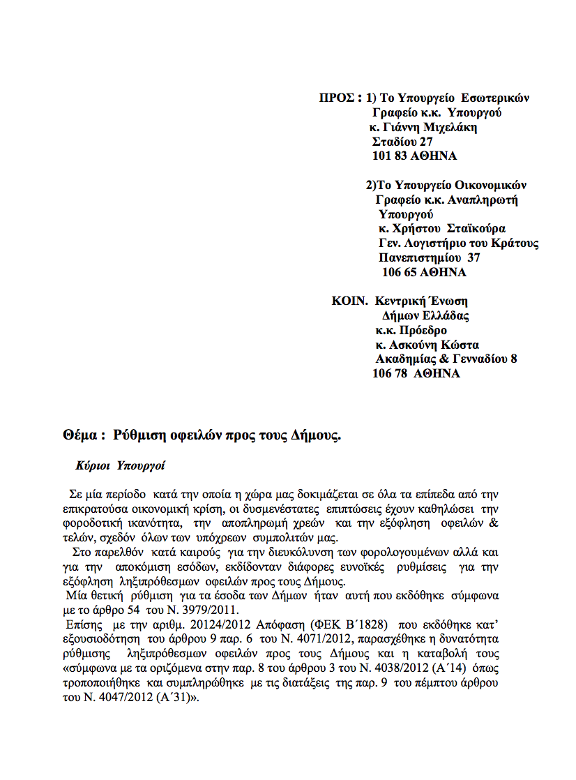 Η επιστολή έχει αποδέκτες τον Υπουργό Εσωτερικών κ. Γιάννη Μιχελάκη και τον αναπληρωτή Υπουργό Οικονομικών κ. Χρήστο Σταϊκούρα, από τους οποίους ζητείται η θέσπιση ρύθμισης και διακανονισμού χρεών που έχουν οι πολίτες προς τους Ο.Τ.Α. και η επέκταση των ευνοϊκών ρυθμίσεων που ισχύουν και εφαρμόζονται σε οφειλές που έχουν οι Έλληνες πολίτες προς το κράτος και για τις οφειλές προς τους Ο.Τ.Α.