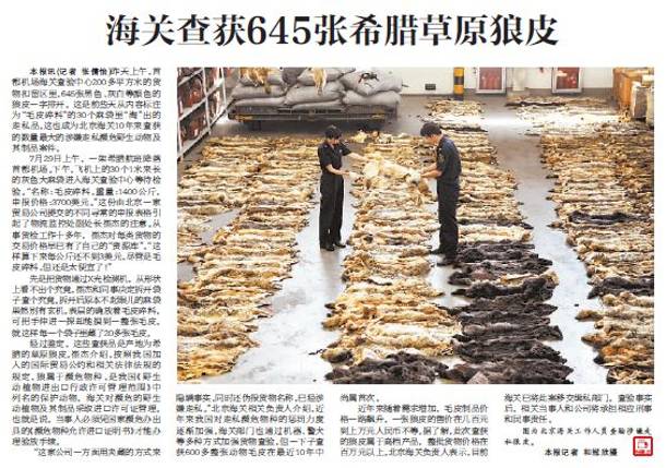 Μια επιχείρηση εμπορίας στο Πεκίνο είναι ύποπτη για το λαθρεμπόριο και έχουν γίνει συλλήψεις, όπως δήλωσαν οι τελωνειακοί υπάλληλοι στα μέσα ενημέρωσης. Η πρώτη εκτίμηση της αγοραίας αξίας των δερμάτων θα μπορούσε να είναι στο ύψος των 1m γιουάν (€ 125.000) ή περισσότερο.