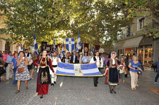 Στη συνέχεια σχηματίστηκε πομπή με επικεφαλής την ελληνική σημαία της ΠΟΠΣΒ ακολουθούμενη από το πανεθνικό φλάμπουρο του Ενθομάρτυρα Ρήγα Βελεστινλή και από τα λάβαρα των τοπικών Συλλόγων. Συνοδεία εικοσαμελούς ορχήστρας και μουσικής πατινάδας γάμου, τα χορευτικά τμήματα των Συλλόγων σε παράταξη διήλθαν τον πεζόδρομο της οδού Διονυσίου Αρεοπαγίτου, πέρασαν από τις «στήλες του Ολυμπίου Διός» και την «Πύλη του Αδριανού» και κατέληξαν στον αύλειο χώρο του ΖΑΠΠΕΙΟΥ.