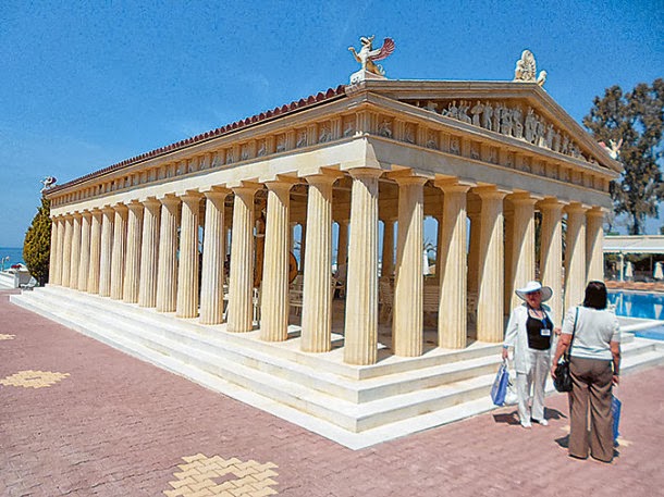 Ο κ. Μπόρις Μουζενίδης φροντίζει να μοιράζεται με τους πελάτες του το πάθος του για την αρχαία Ελλάδα. Στη φωτογραφία, αντίγραφο του Παρθενώνα σε ξενοδοχείο του στη Χαλκιδική