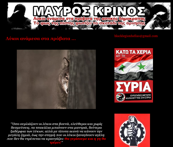 Είναι σκληροί εθνικοσοσιαλιστές. Δεν διστάζουν να σηκώσουν τα όπλα για να υπερασπιστούν το αξιακό σύστημα και την ιδεολογία τους. Αρθρογραφούν, παρεμβαίνουν στα δημόσια ζητήματα και οργανώνουν ακτιβιστικές ενέργειες μέσω του ιστολογίου «Μαύρος Κρίνος», το οποίο βρίσκεται στην ηλεκτρονική διεύθυνση http://mavroskrinos.blogspot.gr/. Μία από αυτές ήταν το «λούσιμο» (με ένα ποτήρι αναψυκτικού) του Βαγγέλη Βενιζέλου στο Παρίσι από «Ελληνα αυτόνομο συναγωνιστή» (όπως αποκαλείται από το ιστολόγιο), στις 15 Ιουνίου. Στη Συρία ο «Μαύρος Κρίνος» δεν παρεμβαίνει μόνο με λόγια. Ούτε με αναψυκτικά. Εκεί βρίσκονται ένοπλοι… ανταποκριτές του. Μια διμοιρία Ελλήνων εθελοντών που πολεμούν στο πλευρό της συριακής κυβέρνησης και του Bashar al-Assad. Η «δημοκρατία» επικοινώνησε με το μέλος της συντακτικής ομάδας του «Μαύρου Κρίνου» Σταύρο Λιμποβίση και πήρε ενδιαφέρουσες απαντήσεις στις ερωτήσεις για τον ρόλο των Ελλήνων μαχητών στη σύγκρουση που λαμβάνει χώρα στη Συρία.