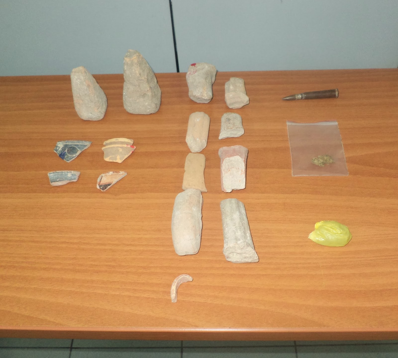 Συνολικά κατασχέθηκαν 9 τμήματα λαβών αγγείων, 4 χείλη αγγείων και 2 υφαντικά βάρη