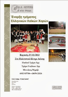 Οι συναντήσεις και πρόβες του τμήματος των παραδοσιακών χορών, με χορούς από όλη την Ελλάδα, θα λαμβάνουν χώρα κάθε Κυριακή πλέον, με έναρξη την παραμονή της Εθνικής Επετείου, δηλαδή, στις 27/10/2013. Για πρώτη φορά εφέτος, και με την στήριξη και του ετέρου συλλόγου του χωριού, του Άγιου Χριστόφορου, γίνεται προσπάθεια να λειτουργήσει και παιδικό τμήμα για τους μαθητές όλων των ηλικιών. Έτσι λοιπόν, στις 5μμ κάθε Κυριακής θα ξεκινά η πρόβα του παιδικού τμήματος και στις 8 μμ του τμήματος ενηλίκων. Χοροδιδάσκαλος και υπεύθυνος των τμημάτων ορίζεται και για την φετινή χρονιά ο πρόεδρος του ΠΑΣ Λεύκης, Μπινιάκος Μιχάλης (6932 917730 για οποιαδήποτε πληροφορία).