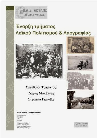 Το τμήμα Λαϊκού Πολιτισμού και Λαογραφίας θα συνεχίσει τις δραστηριότητες του σε τακτά χρονικά διαστήματα, ανάλογα με την φύση των δραστηριοτήτων του κάθε φορά. Επικεφαλής του τμήματος για εφέτος ορίστηκε η Δάφνη Μακάλτση με την συνεργασία της Στεφανίας Γιαννέλα. Εκτός από την συλλογή και ψηφιοποίηση παλιών φωτογραφιών, εφέτος σχεδιάζεται η καταγραφή επιπλέον εθίμων αλλά και καθημερινών δραστηριοτήτων των κατοίκων της Λεύκης. Ειδικότερα, αναλόγως της συμμετοχής και του ενδιαφέροντος, σχεδιάζεται η καθιέρωση εβδομαδιαίων συναντήσεων με μεγαλύτερης ηλικίας κατοίκων στο Πολιτιστικό Κέντρο Λεύκης για συλλογή ιστοριών και εμπειριών.