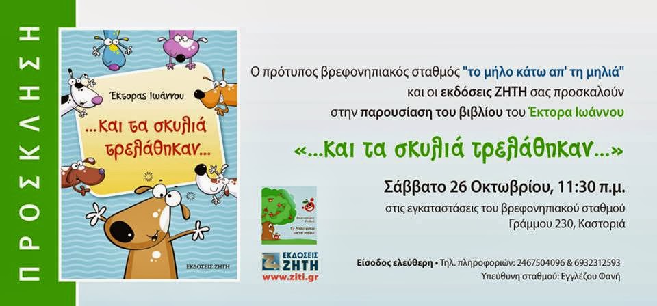 Η Φανή Εγγλέζου υπεύθυνη του βρεφονηπιακού σταθμού “Το μήλο κάτω απ’ τη μηλιά” , επί της οδού Γράμμου 230, στο πλαίσιο παράπλευρων δράσεων, σε συνεργασία με τις εκδόσεις ΖΗΤΗ, διοργανώνει παρουσίαση, του παιδικού βιβλίου “…και τα σκυλιά