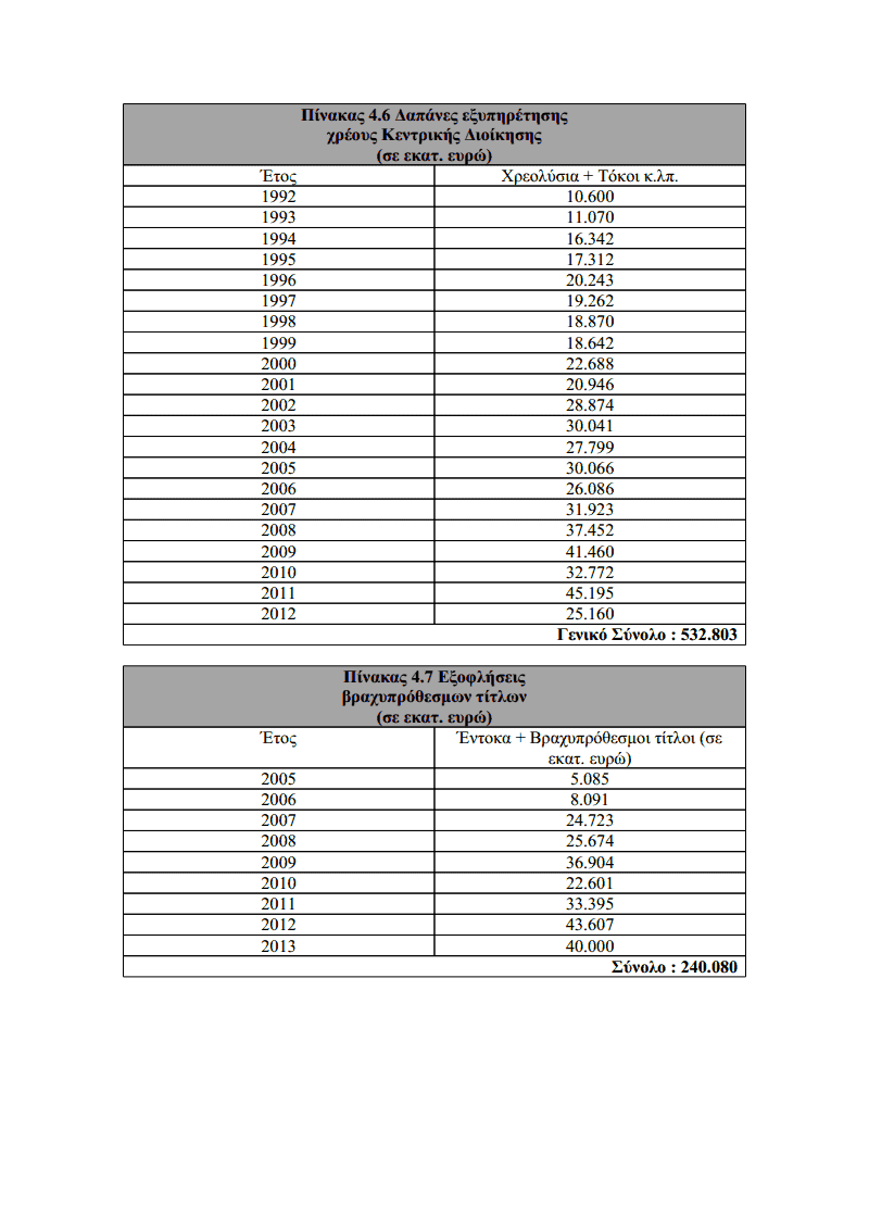 | Τα παραπάνω στοιχεία και οι σχετικοί πίνακες, που περιλαμβάνουν τις δαπάνες για την καταβολή τόκων, χρεολυσίων και τις εξοφλήσεις βραχυπρόθεσμων τίτλων και εντόκων γραμματίων, ομολογούνται στην εισηγητική έκθεση του προϋπολογισμού του 2013 (σελίδα 133) |