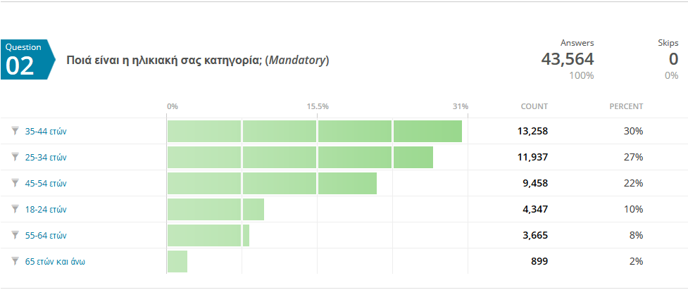 Το μεγαλύτερο μέρος των συμμετοχών αφορά τις ηλικίες 18-64 δημιουργώντας ενα επαρκέστατο δείγμα για να βγουν σαφή συμπεράσματα. Στην κατηγορία 65+ το δείγμα είναι (φυσιολογικά) πιο μικρό επηρεάζοντας όμως σημαντικά και το τελικό εκλογικό αποτέλεσμα καθώς αυτές οι ηλικίες πηγαίνουν παραδοσιακά στην συντριπτική τους πλειοψηφία προς τον πρώην δικομματισμό (ΝΔ/ΠΑΣΟΚ).