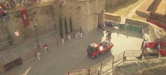 Συγκεκριμένα, το φορτηγό είναι βαμμένο κόκκινο για να προκαλεί τους ταύρους, οι οποίοι το κυνηγούν μανιασμένα στην Ισπανική πόλη Ciudad Rodrigo.