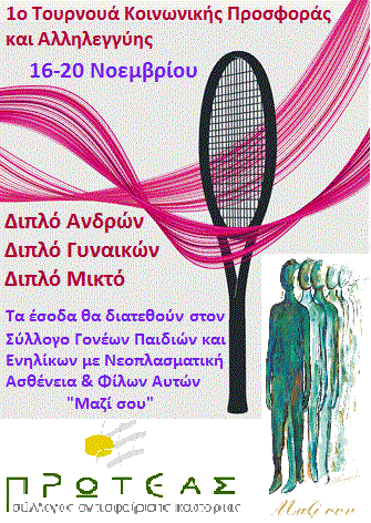 είμαστε δίπλα τους, ο «ΠΡΩΤΕΑΣ» διοργανώνει το “1ο Τουρνουά Κοινωνικής Προσφοράς & Αλληλεγγύης”, 16-20 Νοεμβρίου, με στόχο, όχι μόνο οι φίλοι του αθλήματος να έρθουν πιο κοντά στο τένις, αλλά να αποδειχτεί έμπρακτα η στήριξη τους σε συνανθρώπους μας που το έχουν πραγματικά ανάγκη. Τα έσοδα από την πρωτοβουλία αυτή θα διατεθούν στον Σύλλογο Γονέων Παιδιών και Ενηλίκων με Νεοπλασματική Ασθένεια & Φίλων Αυτών “Μαζί σου”.