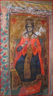 Στο μεταβυζαντινό ναό της Κορησού Καστοριάς, που φέρει την ονομασία «Άγιος Γεώργιος ο Μικρός», σώζεται μία αξιόλογη φορητή εικόνα της αγίας Αικατερίνης. Η μεγαλομάρτυρας, που κατά την επίγεια ζωή της ήταν βασιλοκόρη και ζούσε στην Αλεξάνδρεια της Αιγύπτου, εικονίζεται καθισμένη σε λαμπρό θρόνο, έχοντας βασιλικό στέμμα στην κεφαλή της και φορώντας πολυτελέστατη ηγεμονική στολή. Το πρόσωπο της Αγίας είναι ευγενικό και καλοσυνάτο, το βλέμμα λυπημένο, το ύφος μελαγχολικό. Η μύτη της είναι μακριά κι ευθεία, το στόμα μικρό και ο λαιμός της λεπτός και ψηλός. Έχει μεγάλη καστανόχρωμη κόμη, που πίπτει κυματιστά στους ώμους της. Το εσωτερικό της ένδυμα είναι γαλάζιο, ποδήρες, χειριδωτό και διακοσμημένο με φυλλόσχημα κεντήματα, με χρυσή τραχηλιά και με ταινιόμορφο ποδόγυρο. Απ’ το εμπρόσθιο μέρος του λαιμού της κρέμεται μία μακριά και πλατιά διακοσμητική (;) χρυσοταινία που ομοιάζει με επιτραχήλιο κληρικών, ενώ στη μέση της είναι δεμένη μία παρόμοια ταινία (ζώνη). Στην πλάτη της έχει ριγμένον έναν πορφυρόχρωμο μανδύα με χρυσοκέντητο λαιμόγυρο, που συγκρατείται στο ύψος του στέρνου της με μία χρυσή πόρπη. Στα πόδια της φοράει κομψά υποδήματα, που έχουν ερυθρό χρώμα, όπως και το υποπόδιο του θρόνου. Στο δεξί της χέρι η Αλεξανδρινή αγία έχει υψωμένο λεπτόν μεταλλικό Σταυρό, ενώ στο άλλο κρατάει ένα κλαδί φοίνικα (;), που συμβολίζει τη δόξα που έλαβε με το μαρτύριό της.