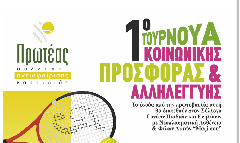 είμαστε δίπλα τους, ο «ΠΡΩΤΕΑΣ» διοργανώνει το “1ο Τουρνουά Κοινωνικής Προσφοράς & Αλληλεγγύης”, 16-20 Νοεμβρίου, με στόχο, όχι μόνο οι φίλοι του αθλήματος να έρθουν πιο κοντά στο τένις, αλλά να αποδειχτεί έμπρακτα η στήριξη τους σε συνανθρώπους μας που το έχουν πραγματικά ανάγκη. Τα έσοδα από την πρωτοβουλία αυτή θα διατεθούν στον Σύλλογο Γονέων Παιδιών και Ενηλίκων με Νεοπλασματική Ασθένεια & Φίλων Αυτών “Μαζί σου”.