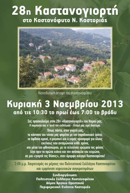 Ο Πολιτιστικός Σύλλογος Καστανοφυτών «Η Αγία Παρασκευή» διοργανώνει την Κυριακή 3 Νοεμβρίου 2013 για 28η χρονιά την Καστανογιορτή…
