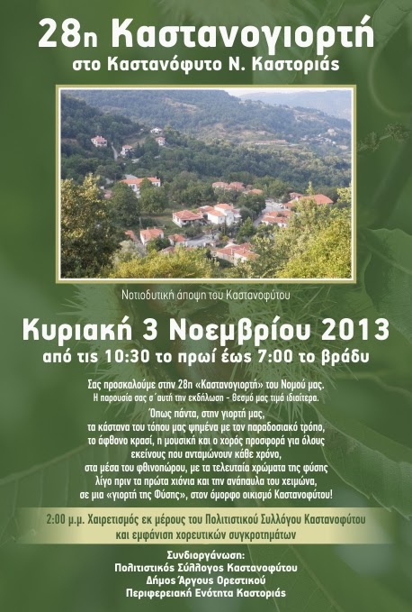 Ο Πολιτιστικός Σύλλογος Καστανοφυτών «Η Αγία Παρασκευή» διοργανώνει την Κυριακή 3 Νοεμβρίου 2013 για 28η χρονιά την Καστανογιορτή…