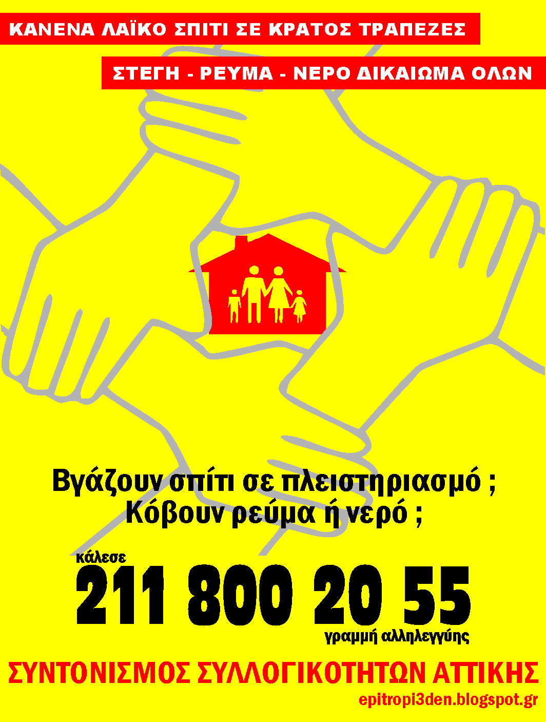 Β. Την Κυριακή 8/12/2013 ώρα 11 το πρωί στον κινηματογράφο Μικρόκοσμος λεωφ. Συγγρού 106, κοντά στο σταθμό Συγγρού στο Μετρό σε ανοικτή συνάντηση για τον προγραμματισμό των δράσεων μας ενάντια σε πλειστηριασμούς-κατασχέσεις.