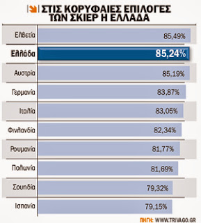 Πρώτη στις προτιμήσεις των χρηστών, βάσει των κριτικών τους, βρίσκεται, όπως είναι αναμενόμενο, η Ελβετία, ενώ η δεύτερη θέση της Ελλάδας, με ποσοστό δημοτικότητας 85,24%, προκαλεί έκπληξη. Την τρίτη θέση και μία θέση κάτω από την Ελλάδα, αν και παραδοσιακά γνωστός χειμερινός προορισμός, καταλαμβάνει η Αυστρία. Τα αποτελέσματα βασίζονται στις κριτικές που έχουν γράψει οι χρήστες που έχουν επισκεφτεί τους προορισμούς σκι που διαθέτει κάθε χώρα, ενώ όλοι οι προορισμοί διαθέτουν από 40 ξενοδοχεία και πάνω.
