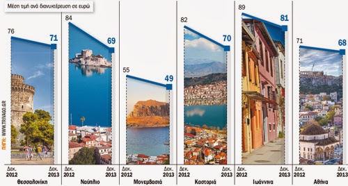Είναι ενδεικτικό ότι, σύμφωνα με τις μετρήσεις της Trivago, στα Ιωάννινα η μέση τιμή ανά διανυκτέρευση μειώνεται κατά 9% σε σχέση με τον Δεκέμβριο 2012 (81 ευρώ, έναντι 89 το περασμένο έτος), στην Καστοριά η μείωση αγγίζει το 15%, με τη μέση τιμή ανά διανυκτέρευση από 82 ευρώ τον περασμένο χρόνο να πέφτει φέτος στα 70 ευρώ, ενώ στη Μονεμβασιά η μέση τιμή κυμαίνεται στα 49 ευρώ, έναντι 55 ευρώ τον Δεκέμβριο του 2012 (μείωση 11%).
