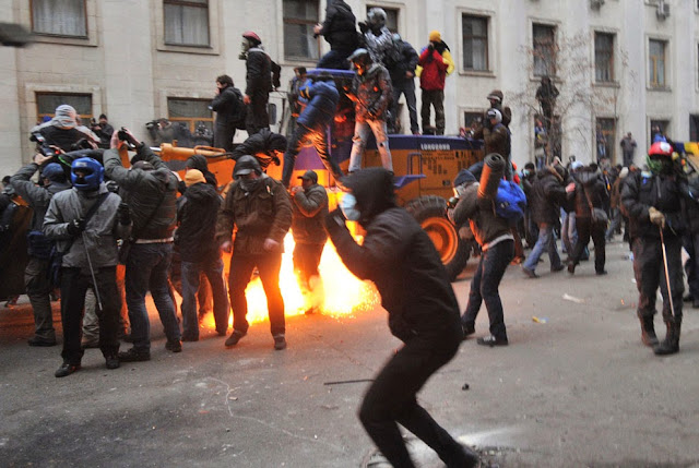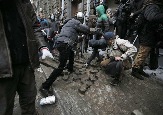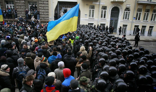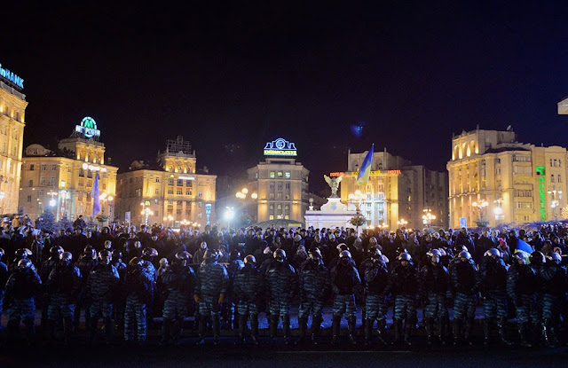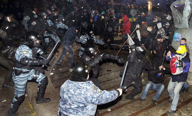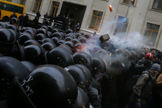 Οι διαδηλωτές προσπαθούν να σπάσουν μέσω των αστυνομικών γραμμές κοντά στο προεδρικό κτίριο διοίκησης κατά τη διάρκεια συγκέντρωσης που πραγματοποιήθηκε από τους υποστηρικτές της ευρωπαϊκής ολοκλήρωσης στο Κίεβο, την 1η Δεκεμβρίου 2013. Οι