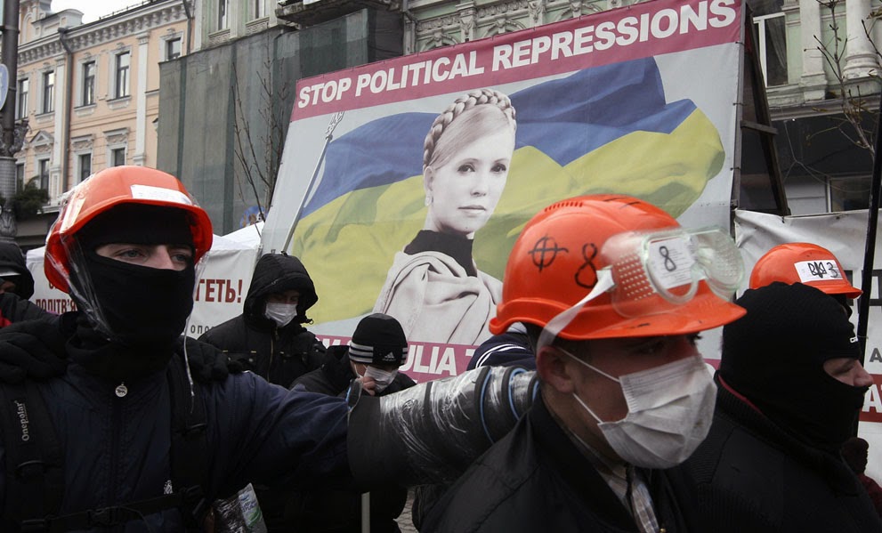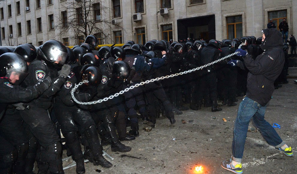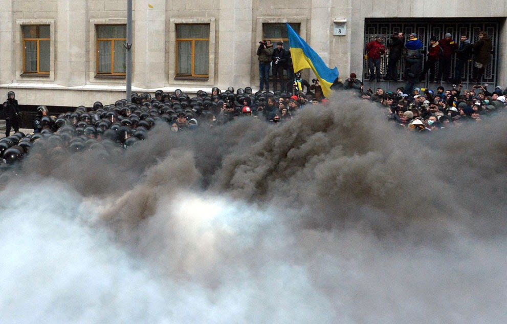Οι διαδηλωτές προσπαθούν να σπάσουν μέσω των αστυνομικών γραμμές κοντά στο προεδρικό κτίριο διοίκησης κατά τη διάρκεια συγκέντρωσης που πραγματοποιήθηκε από τους υποστηρικτές της ευρωπαϊκής ολοκλήρωσης στο Κίεβο, την 1η Δεκεμβρίου 2013. Οι