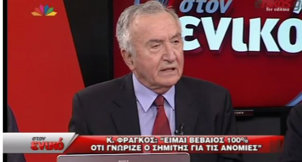 Αίσθηση προκάλεσε η τοποθέτηση του υποστράτηγου εν αποστρατεία Κωνσταντίνου Φράγκου στην εκπομπή “στον ενικό” για το σκάνδαλο των εξοπλισμών. “Η εποχή Καραμανλή στην κυβέρνηση σήμαινε ταφή όλων των ανομημάτων της οκταετίας του ΠΑΣΟΚ”, δήλωσε ο κ. Φράγκος και πρόσθεσε: