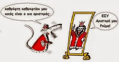 εφαρμογής των όσων διακηρύσσετε τόσα χρόνια, εσείς δειλιάζετε και ενστικτωδώς αντιδράτε περιχαρακωνόμενοι, παίζοντας φοβική άμυνα. Λέγεται και κόμπλεξ. Η επίσημη ονομασία της ψύχωσης αυτής ονομάζεται “Αριστερή Ρευμα-τοπάθεια”. - Στο βαθμό που δεν ισχύει το από πάνω, απλώς φοβάστε πως η είσοδος των, δημοφιλέστερων από σας, στελεχών που προέρχονται από το χώρο του ΠΑΣΟΚ, θα δώσει σε αυτούς τις κυβερνητικές καρέκλες κι εσείς θα μείνετε στην απ’ έξω. Ο καβγάς είναι για το πάπλωμα λοιπόν.