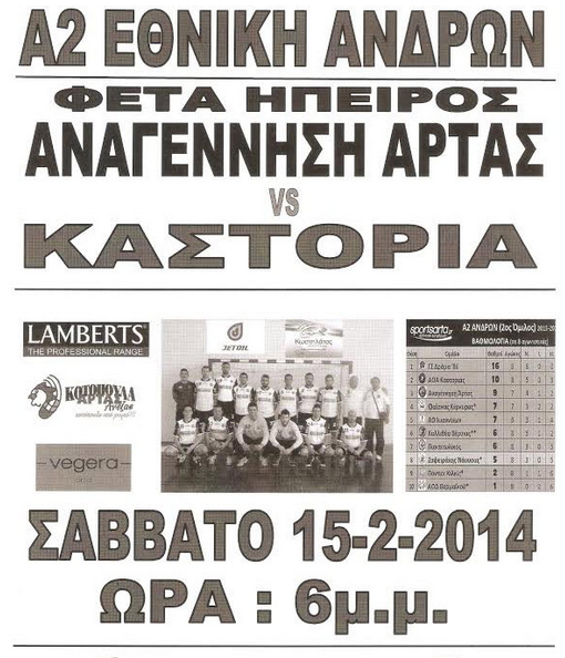 Σούπερ ντέρμπι μεταξύ της ΦΕΤΑ ΗΠΕΙΡΟΣ ΑΝΑΓΕΝΝΗΣΗΣ ΑΡΤΑΣ και της ΚΑΣΤΟΡΙΑΣ το Σάββατο 15-2-2014 στις 6μμ στην Άρτα για την Α2 Εθνική Ανδρών.