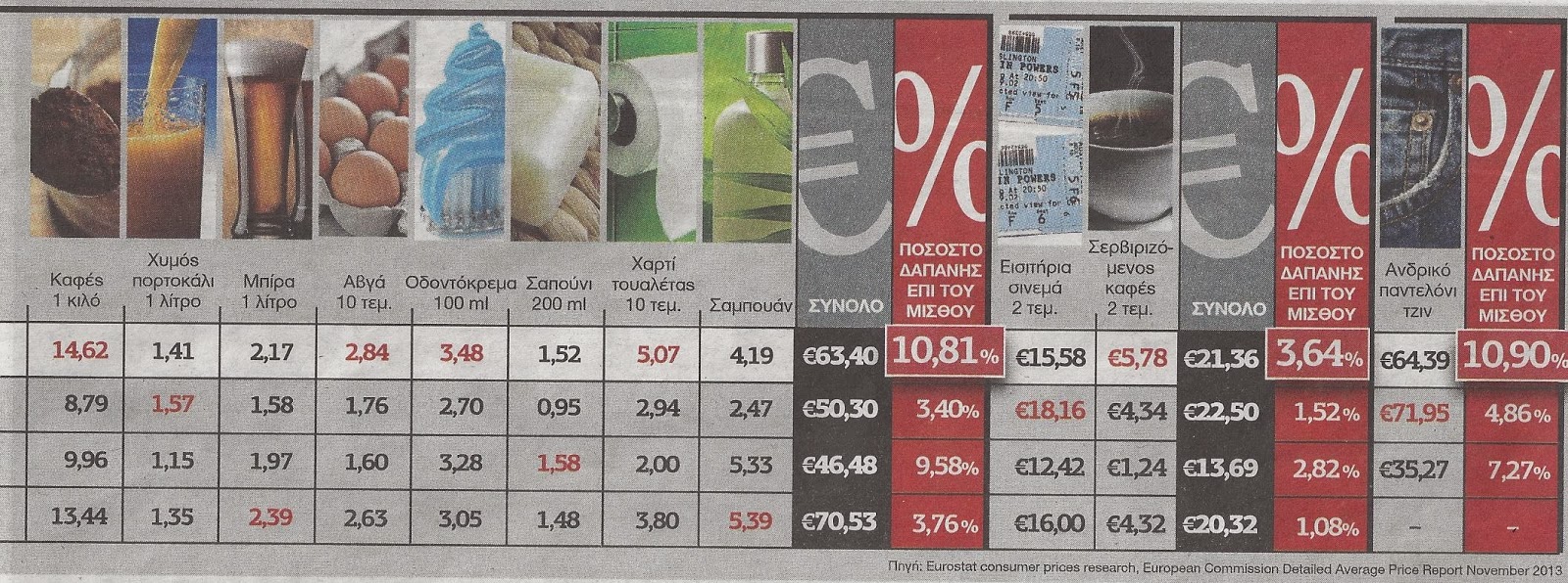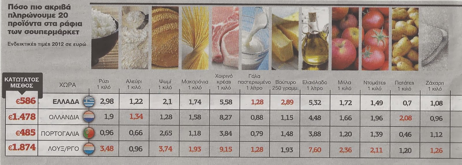 Σύμφωνα με Τα Νεα, σε σχέση με τις τιμές στο ράφι, η Ελλάδα δεν είναι η ακριβότερη χώρα. Συνδέοντας όμως τις τιμές των προϊόντων αυτών με τα εισοδήματα των Ελλήνων αντιλαμβάνεται ότι η Ελλάδα σε πραγματικούς όρους είναι η πιο ακριβή χώρα.