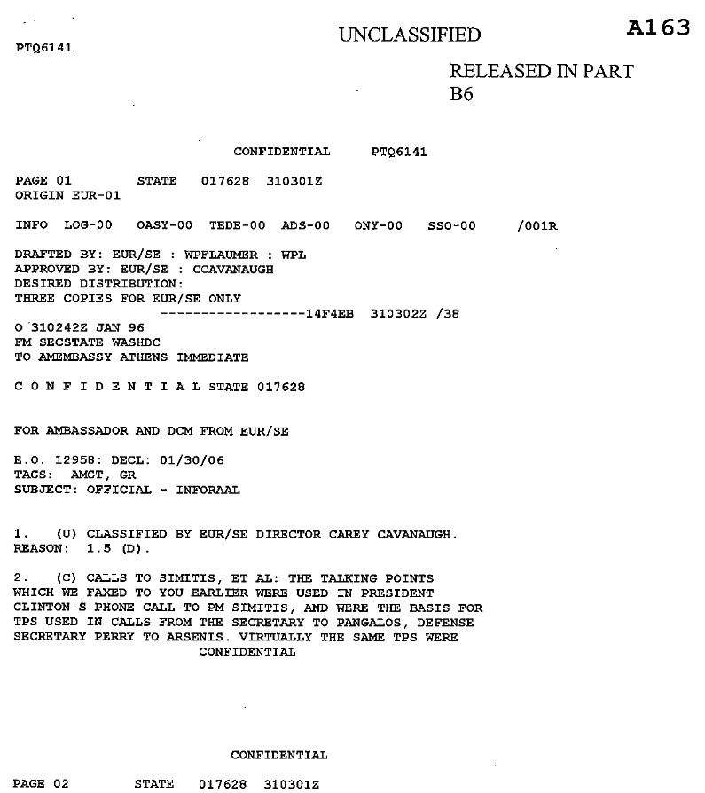 σε εμπιστευτικό τηλεγράφημα, που υπέγραψε ο τότε υπουργός Εξωτερικών των ΗΠΑ, Γουόρεν Κρίστοφερ: