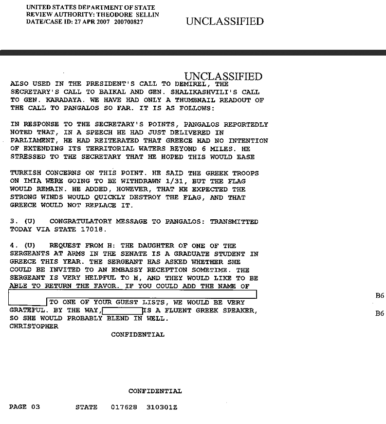 3. Συγχαρητήριο μήνυμα στον Πάγκαλο: διαβιβάσθηκε σήμερα μέσω του μηνύματος 17018 του Στέιτ Ντιπάρτμεντ».