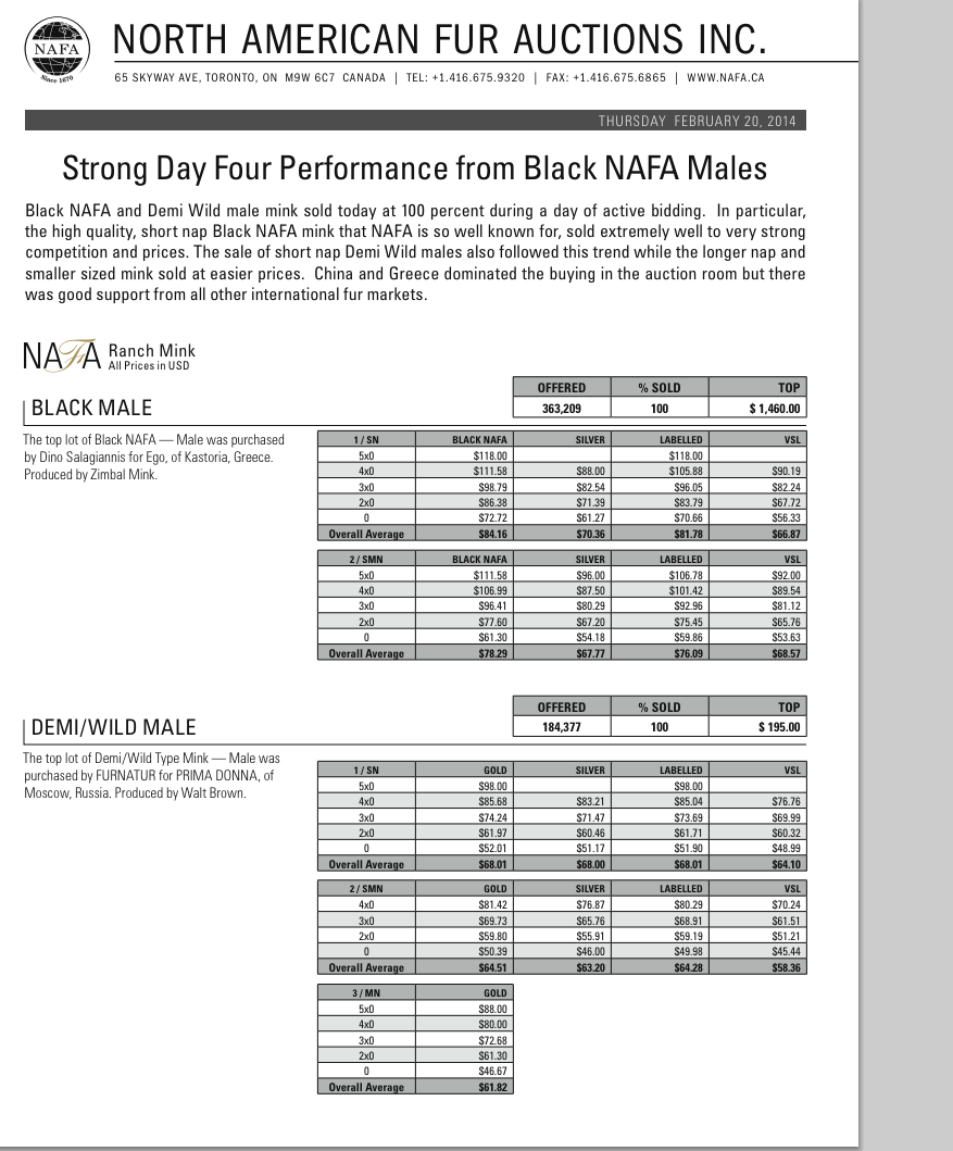 Τα Black NAFA και Demi Wild male mink πουλήθηκαν κατά την τέταρτη ημέρα διεξαγωγής της δημοπρασίας κατά 100 τοις εκατό σε μία έντονη και ιδιαίτερα έντονη ημέρα προσφοράς και ζήτησης. Ειδικότερα, τα υψηλής ποιότητας short nap Black NAFA στα οποία η NAFA ειδικεύεται, πωλήθηκαν πολύ καλά σε έντονο ανταγωνισμό και τιμές.