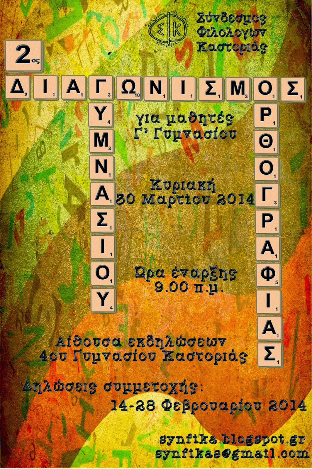 Ο Σύνδεσμος Φιλολόγων Καστοριάς διοργανώνει τον 2ο Διαγωνισμό Ορθογραφίας για μαθητές Γ΄ Γυμνασίου των σχολείων του Νομού της Καστοριάς την Κυριακή 30 Μαρτίου 2014, στην αίθουσα εκδηλώσεων του 4ου Γυμνασίου Καστοριάς, από τις 9.00 το πρωί. Ο